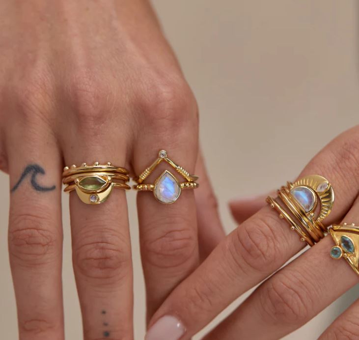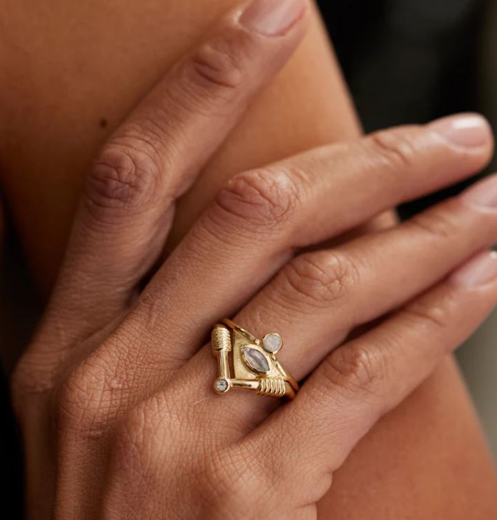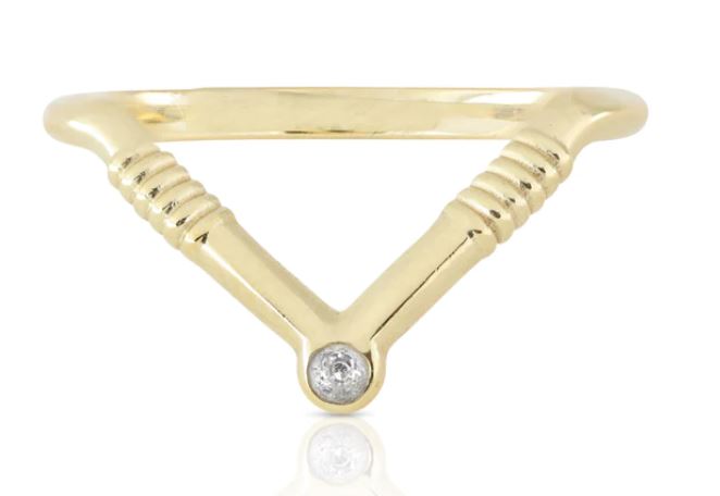 The Banded Chevron Stacker is a V shaped stacking band made perfectly to pair with our trillion, Nile and Solaris bands. The band features delicate banded detailing on the sides of the ring and a tiny faceted moonstone at it's point.