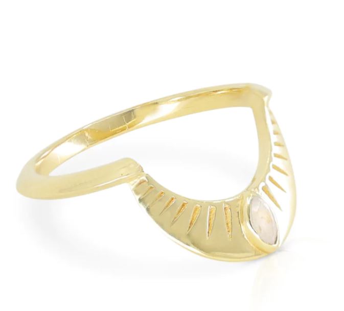 The Dawn Moonstone Halo is a crescent shaped stacking band. With a high polish the band features a luminous hand cut moonstone set between radiating lines to replicate the new dawn. This crescent band is designed to arc over most of our stacking bands with a internal measurement of 12x6mm in the arc of the crescent.