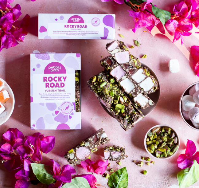 This one’s for the romantics, the old souls, and the lovers of all things a little bit boujee. Made with our signature 38% milk chocolate (that’s richer and smoother than your average), it’s studded with fragrant rose Turkish delight handcrafted by a family-run small business in Sydney NSW, pillowy marshmallows, crunchy locally grown & roasted peanuts and almonds, and finished with pops of pistachio for that luxe little twist.